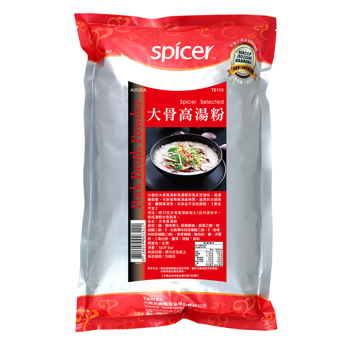 Product Name Pork Broth Powder Product Features The unique flavour with nature spice ingredient. Product NO. A0020AT6110 International Barcode 4710059003421 Shelf life 24 Net weight 1kg/BAG Ingredients Salt , Flavorings(Monosodium Glutamate, Glycine , Disodium Succinate , Sodium 5,-Inosinate , Sodium 5,-Guanylate) , Maltodextrin , Pork Extract Powder , Sugar , Onion Powder , Silicon Dioxide , Ginger , Pepper , Flavor 【Non-vegetarian】 Country of origin tw Speciality Vegetarians should avoid or Not suitable for vegetarians -