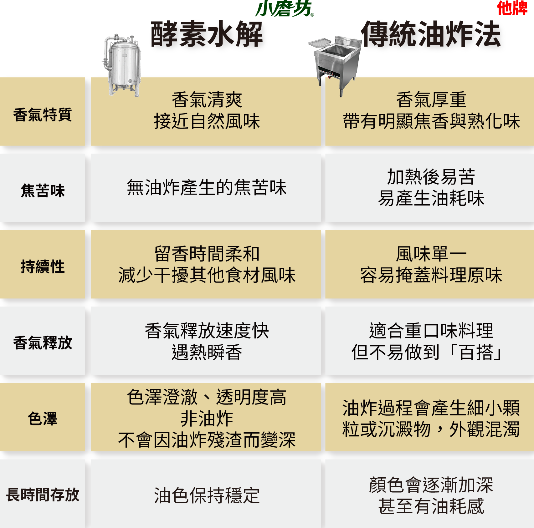 利用低溫酵素分解食材細胞壁,將天然香氣與風味分子釋放並溶入油中,強調「溫和萃取、還原食材本味」。避免高溫造成焦苦或失真,能保留紅蔥、蒜頭的清新原香,呈現風味更完整,且穩定度高,適合不同料理場景使用。