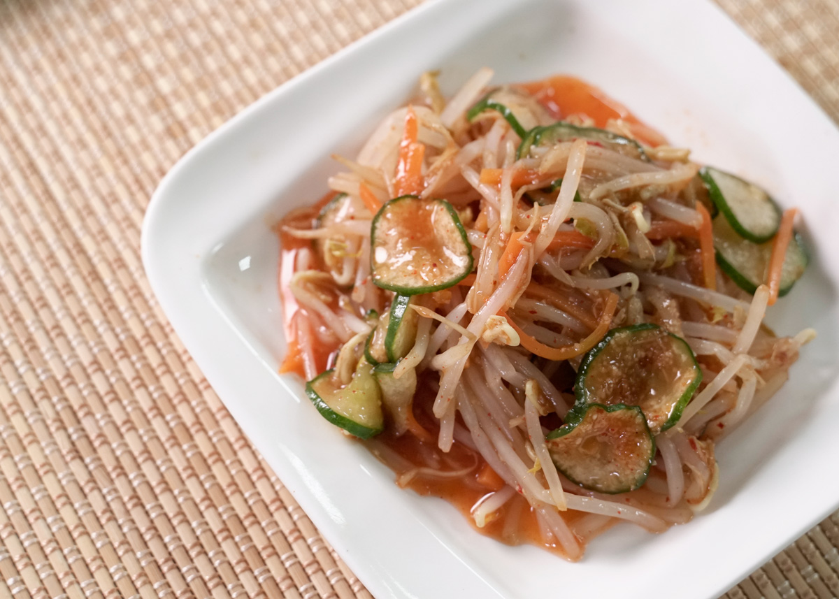 將煮熟的黃豆芽、紅蘿蔔及黃瓜片,放到容器中,撒上香蒜粒及韓式辣炒醬,拌勻後即可食用。