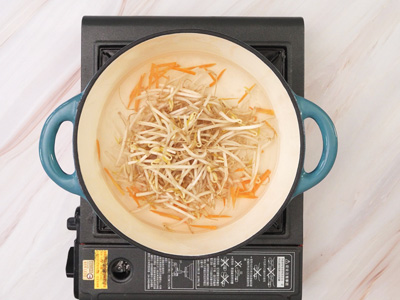 取一鍋熱水加入一大匙鹽,水滾後放入黃豆芽跟紅蘿蔔,煮熟後取出備用