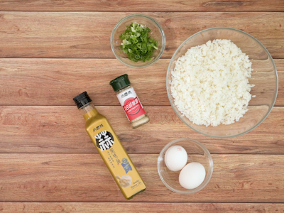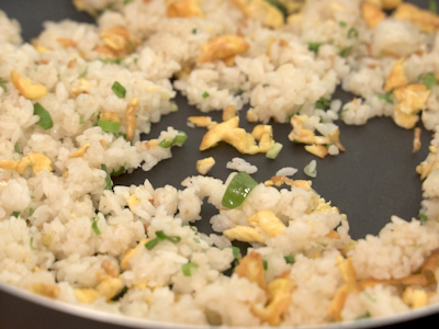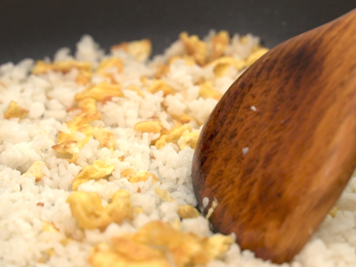 倒入白飯拌炒均勻,運用鍋鏟前端分開結塊的白飯,炒至粒粒分明。