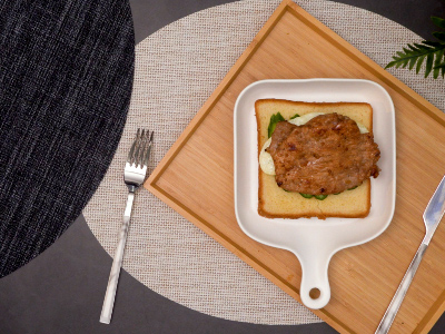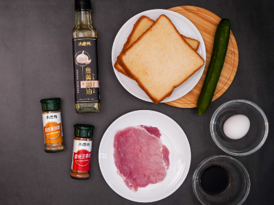 將小黃瓜片、肉排、荷包蛋擺上吐司,撒上蒜香黑胡椒再蓋上吐司即完成