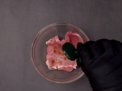 豬里肌斷筋後以醬油、蒜香黑胡椒、五香粉醃漬靜置