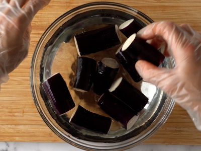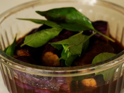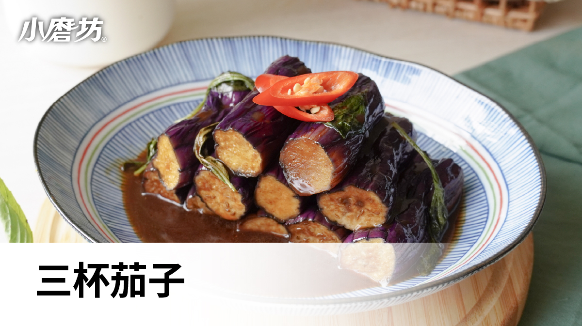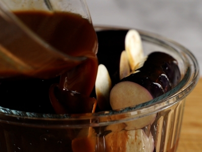 茄子放置碗中,三杯醬與少許水調勻後淋上茄子,蓋蓋微波3-5分鐘(視各微波爐功率而定)