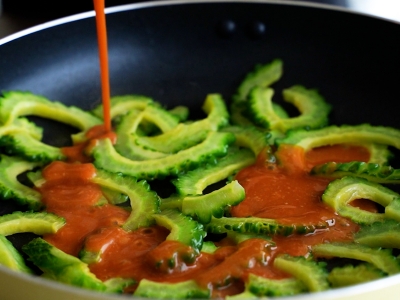 熱鍋加入金黃蒜油,放入山苦瓜拌炒,加入30毫升水再拌炒為水炒法,蓋上鍋蓋燜2分鐘後取出。