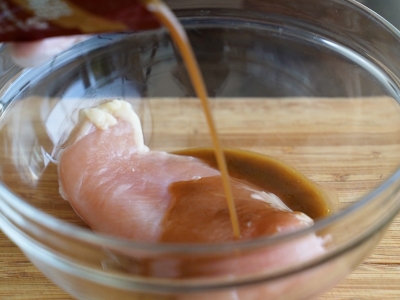 一片雞胸肉配一包台味爆炒薑香鍋醬,冰進冰箱醃漬1小時。