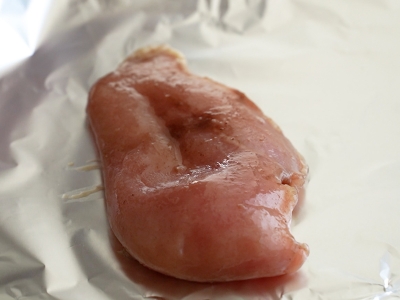鋁箔紙包雞胸肉放進氣炸鍋中,180度15分鐘,即可起鍋盛盤。