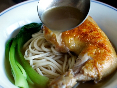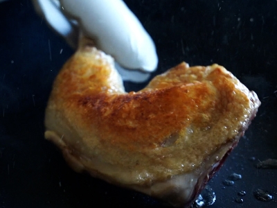 起油鍋煎雞腿至全熟、外皮呈現金黃色澤。