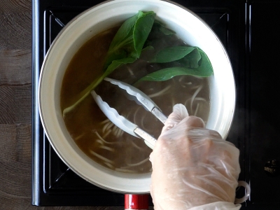 青江菜洗淨備用、起滾水將家常麵煮熟撈起,瀝乾水後盛碗備用。