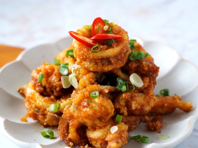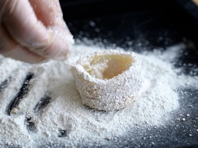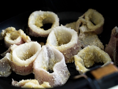 中卷切圈加入少許鹽、蛋黃拌勻後,裹上地瓜粉,靜置5分鐘反潮。