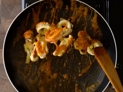 熱鍋轉小火將鹹蛋黃醬拌勻後快速攪拌均勻,待醬汁冒泡後,回鍋加入氣炸好的中卷。
