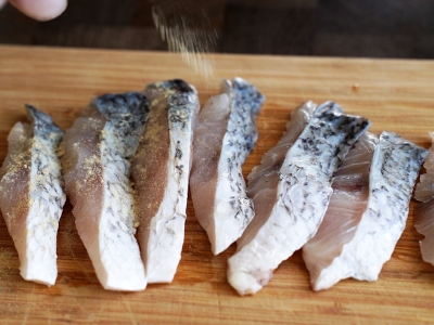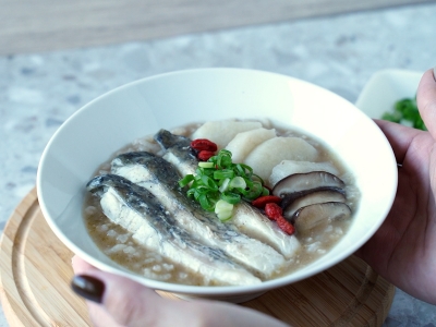 將鱸魚切片撒上白胡椒粉後備用;山藥去皮切塊,暫泡水防氧化;香米洗淨備用,香米事先浸泡30分鐘;切香菇、蔥花。
