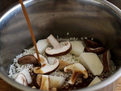 取電鍋內鍋中,加入香米、山藥、鮮香菇、小磨坊台味爆炒薑香鍋醬、內鍋3杯水、外鍋1杯水,煮30分鐘至熟透。