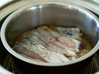 加入枸杞、鱸魚片,電鍋外鍋再加入半杯水,悶煮至魚片熟透即可。