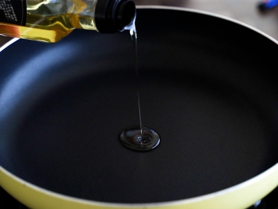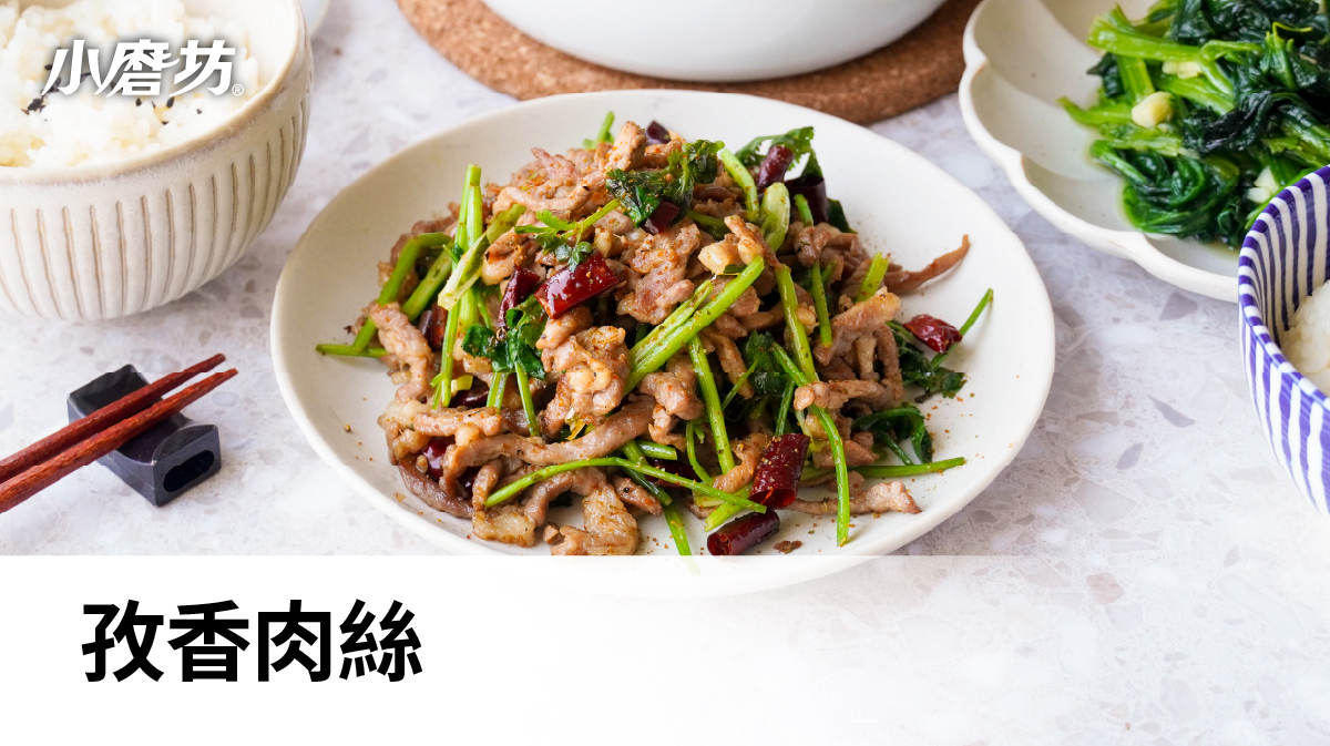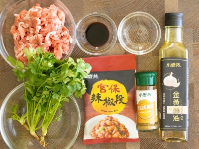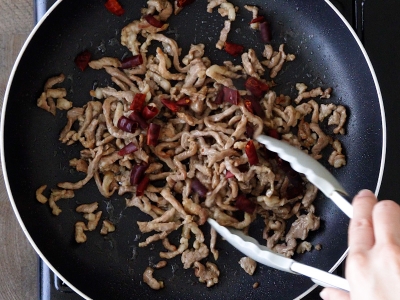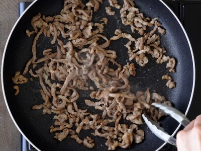 熱鍋倒入5ml金黃蒜油。 倒入豬肉絲,以中小火拌炒至8分熟,並以孜然風味料調味。