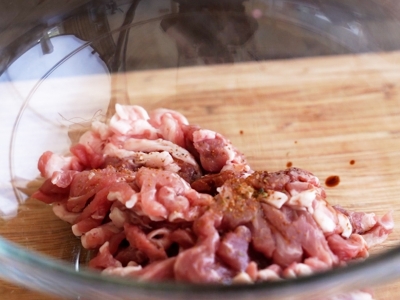 豬肉絲以2g孜然風味料、醬油、米酒、5ml金黃蒜油抓醃30分鐘。